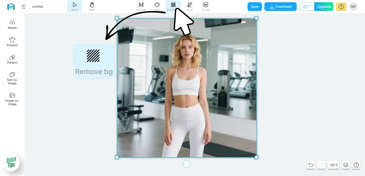Click the Remove BG option on the top bar, utilize our AI technology to automatically eliminate the background in seconds.
