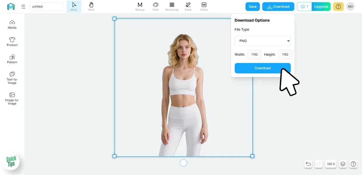 After you remove the background from image, you could download, convert it into a mockup or use it as a design on your product mockup images.